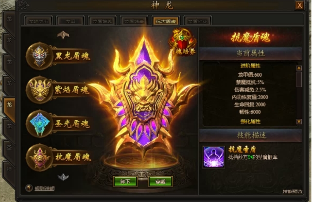 1.新增【抗禁魔盾魂】,激活后可永久增加1%~5%的禁魔抵抗,可前往【神龙-龙甲-远古盾魂】查看