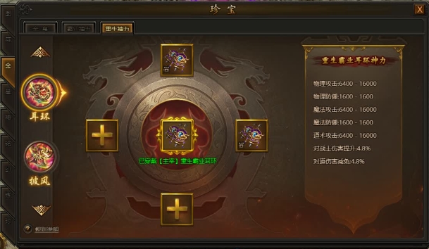 1.重生霸业神力拓展4个重生霸业内饰孔位,可前往【珍宝-金身-重生神力】查看