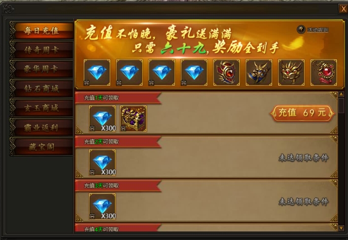 2.单日累计充值6900元宝达到指定天数,可以领取对应档位奖励